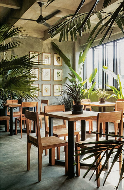 Di bagian bawah, tanaman-tanaman dalam pot besar berbaris menutupi bagian muka dengan bukaan di depan pintu kaca yang terletak di tengah. Pada langit-langitnya, pot-pot kecil tergantung membentuk garis lurus dengan daun-daun yang menjulur ke bawah. Begitu pun teras di lantai-lantai berikutnya yang terlihat dari depan. Daun-daun berwarna hijau menyeruak seakan ingin bersenda gurau dengan angin semilir di depannya. Sementara dinding bangunan ini dibiarkan telanjang tanpa cat