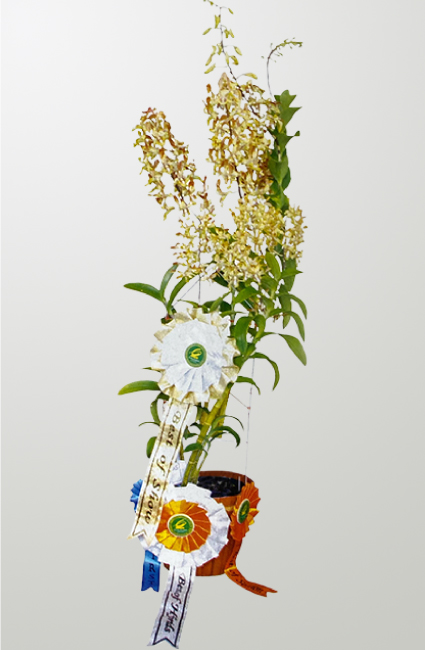 Dend. Golden Rood x Dend. Husmadi berwarna kuning keemasan dan kuning kecokelatan. Dalam satu pot terdiri dari 11 tangkai yang berbunga semua. Empat tangkai masing-masing terdiri dari 50 kuntum bunga yang sedang mekar. Sisanya, 7 tangkai, memamerkan 35-45 bunga. “Total bunga yang kuncup dan mekar mencapai 676 kuntum,” ujar Vincent, sang pemilik. Selain itu, susunan bunga rapat, rapi, dan seimbang sehingga terlihat menggerombol. Tangkai bunga sempurna tanpa ada yang kedodoran walaupun menahan sekitar 40 kuntum yang tebal dan cukup besar, berdiameter 4 cm.